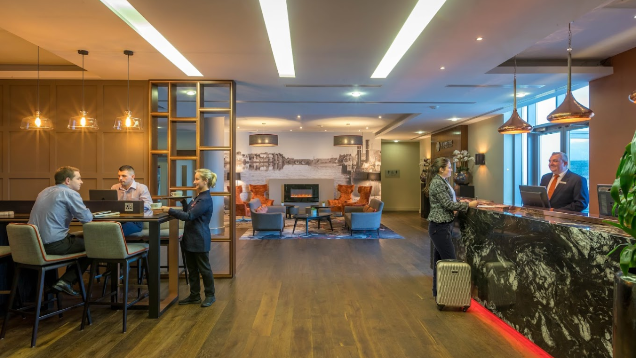 Clayton Hotel Limerick, towering elegantly over the River Shannon, stands as Ireland’s tallest hotel, offering stunning views of Limerick’s skyline from its strategic position in the city center. This four-star hotel provides a unique blend of modern design and comfort, featuring well-equipped rooms that cater to both business and leisure travelers. Guests can enjoy dining at the hotel’s restaurant, which serves a range of international and local dishes, or relax in the stylish bar with a panoramic view. Additional amenities include a fitness center, swimming pool, and extensive conference facilities, making it an ideal choice for events and meetings. Just a short walk from major attractions and shopping areas, Clayton Hotel Limerick offers a prime location for exploring all that the city has to offer.